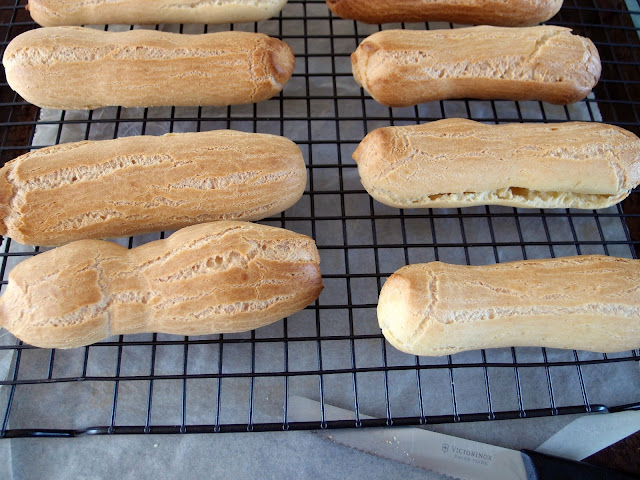 Bake the éclairs for 30 minutes until puffed and golden brown. Remove from the oven, slit the side of each éclair to release the steam, then allow to cool.