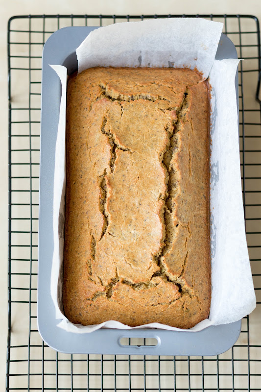Scrape the batter into the prepared pan, smooth the top and bake for 50 - 55 minutes, until a skewer inserted into the centre comes out clean.  Leave in the pan for 20 minutes before turning out on to a wire rack to cool. Slice thickly when warm or at room temperature and serve with butter or just as is... it's all good.